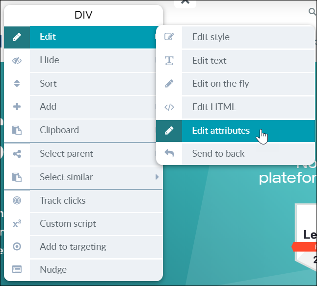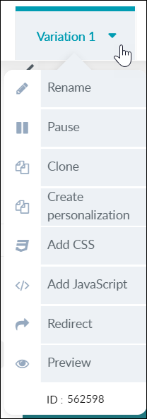 「バリエーション 1」のタブをクリックして、エディター上で有効にします。ページ上でマウスを動かすと、ページ要素がハイライト表示されるのがわかります。左クリックして、その中の一つを選択します。コンテクストメニューが表示され、選択した要素を修正したり、選択範囲を狭めたりするためのいくつかのオプションが表示されます。