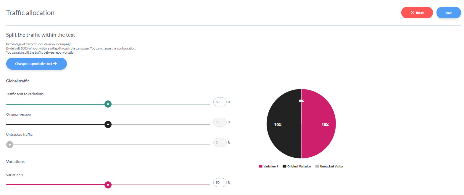 最後に、各バリエーションに割り当てるトラフィックの割合を定義するには、「Traffic Allocation」リンクをクリックします。ウィンドウが表示され、スライダーを使って特定の割合を各バリエーションに割り当てることができます。