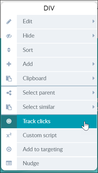 * **クリック指標：**&#x30A2;クションボタン（例：カートに入れるボタン）のように、追跡したい特定の重要な要素のクリック率を簡単に測定することができます。これを行うには、エディタで要素を選択し、「Track Clicks」項目を選択します。\