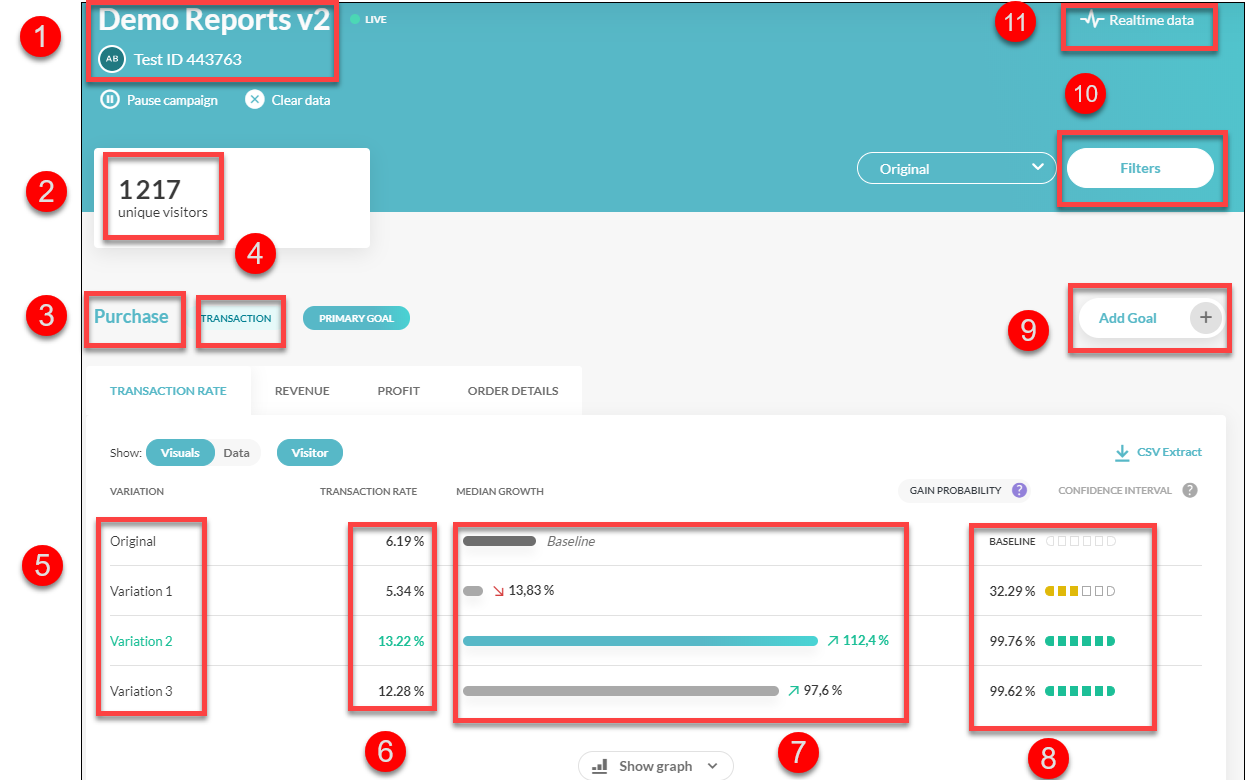 また、トラフィックの発生源や訪問者の行動など、さまざまな基準でデータをフィルタリングすることで、テスト結果を絞り込むことができます。下のドロップダウンメニューを使って、実行したい分析に合わせてフィルターを調整してください。